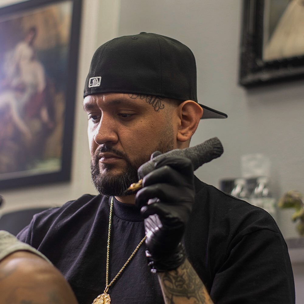 Originally from Dallas, Texas, Solomon is a proud Chicano tattoo artist whose work blends deep cultural roots with refined technique. Now based in Denver, he has built a reputation for high-end lettering and black and grey realism that speaks through bold storytelling and soulful detail. His artistry has taken him around the world, tattooing in places like Australia, Italy, and Mexico City, where he continues to draw inspiration from different cultures while staying true to his roots. Whether it’s intricate script, powerful portraits, or sacred symbolism, Solomon delivers work that’s as meaningful as it is unforgettable.